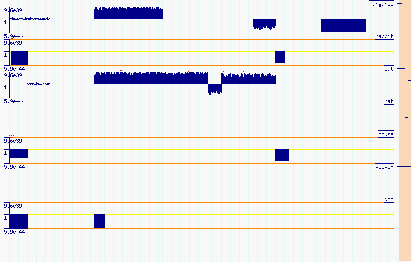 This mini-tutorial section will guide you through the Phylogenetic Tree Viewer. It is a track that will draw a cladogram of species that have alignments with the species within the set view window. The alignment scores will be drawn at far magnification, and the DNA alignments for close magnification. This tutorial is based on the Volvox database created within the main GBrowse2 tutorial.