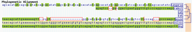 Figure AAB: Phylogenetic alignments at the DNA level. Note that as 'dog' is not included in the original tree file, it will be placed as a disconnected member of the cladogram.